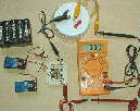 Note that alligator clip test leads are used to connect between the parts, and a bare alligator clip is shown connecting one battery lead to one bulb lead. Radio shack should be able to provide most of the parts we'll show on this page, while Mouser Electronics supplied the bulb shown in the photo; you can read their info in the larger version of the photo.