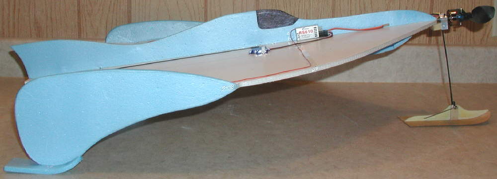 This just might also be one of the best candidates for setting up as a night flying LED lighted "UFO" type design. I'll write up the information for doing that, drawing power from the receiver's unused rudder channel output, as time allows. (I may also design a lightweight mono-ski for flying from & landing on softer snow, that will mount on the simple front landing gear.)