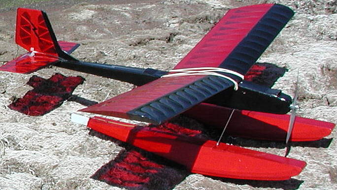 This "LECTRA SPORT" is not a 'new' design; I actually designed and built this electric aircraft in about 1986, so it's a veteran of many years of flying. It's wing uses a flat bottomed airfoil with a 50" wingspan, 9" chord, built using an aluminum arrow shaft leading edge, and built with angled wing tips. It currently flies with Rudder, Elevator, and Electronic throttle controls- (no ailerons were built into the original wing.) Fuselage length is about 37". The floats were built from a Mitch Poling design which was published in 'Model Builder' magazine back in the mid 1980s; they have a flat bottom wth a pronounced side angle. I added triangle rails on the forward hull outer edges, which really help to get this plane up on step & off the water quickly. It uses a single water rudder on the tail end of one float; early attempts to maneuver on the water in breezes without the water rudder were less than satisfactory...