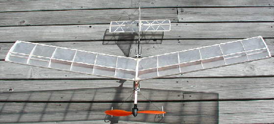 Weight: typically 7.75 ounces when flying with an 8 cell 300mAH NiMH battery, for a wing loading of 3.25 ounces per square foot