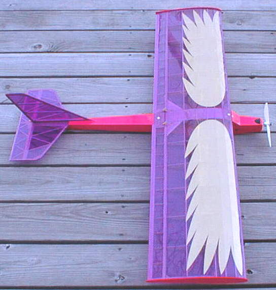 I was designing as a higher speed aerobatic aircraft, with an airfoil that would handle higher wind speeds and inverted flight well. I designed it for the MABUCHI FS-390 motor & Gunther 7x6 prop setup. Flying at 20.5 ounces on an 8 cell N-500A pack, this aircraft has once again exceeded my design expectations.