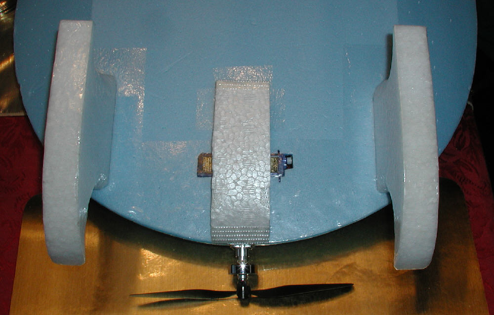 Above: Foam was cut oversize for the first prototype of the upper fuselage, offering the possibility of mounting the motor well above the wing so that shorter landing gear or lower profile skis might be used. I then chose next to cut down some of the extra upper fuselage foam, and to mount the motor just above the center line of the wing, since I firmed up my plans to use the taller profile EPP skis.