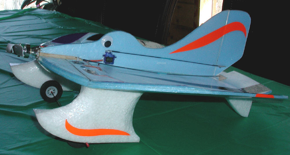 The result is what you see in the photos. Airframe total weight is 7 Oz without the battery; with a 2S 460 battery, the flying weight is at 8 ounces, for a wing loading of 3.5 ounces per square foot. It now balances for flying with the battery about 1-1/4" to the rear of where it mounts when flying without the float/skis, still within the battery compartment.