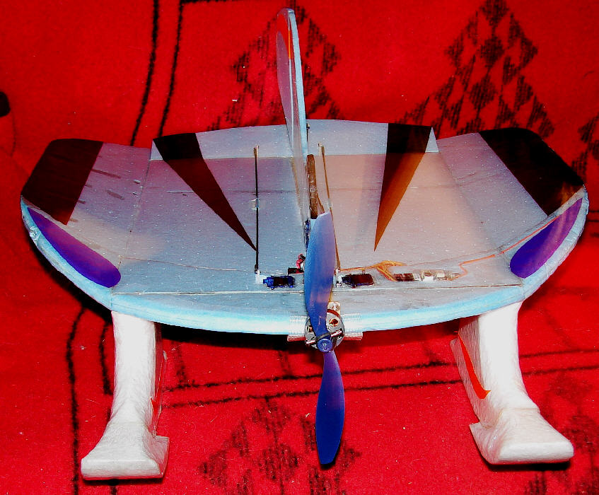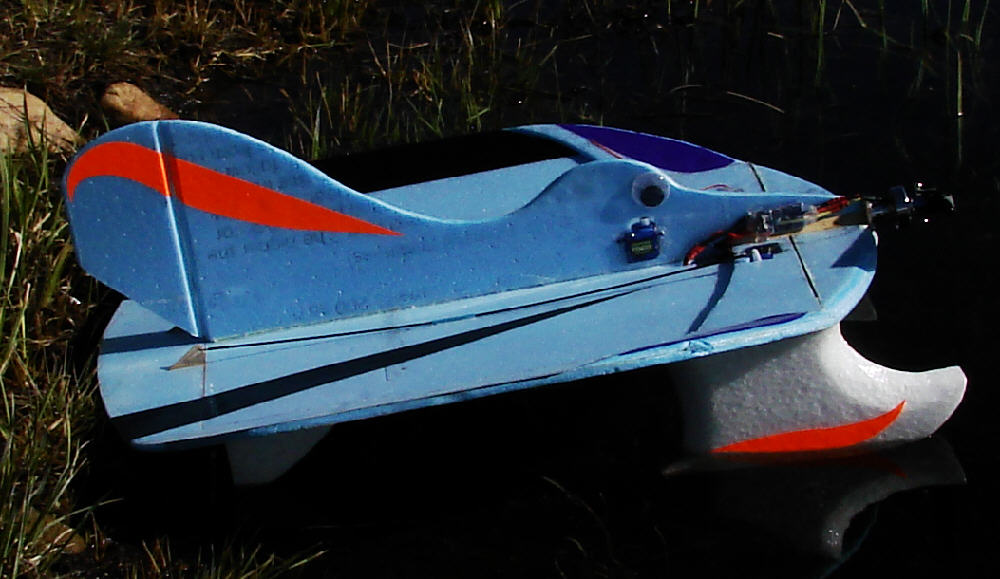Having the center panel width at 60% of total span, with each wing tip panel at 20% of total span, and the wing tips set at 20 degrees dihedral seems to be a good balance for flying with both elevons & rudder. The result is a fun flier which responds well to the rudder for great ground / water handling, and which also rolls fairly axially in the air and can fly inverted easily when using the elevons. (The widened trailing edge of the wing, and the wider % center panel allows for more elevon area.)