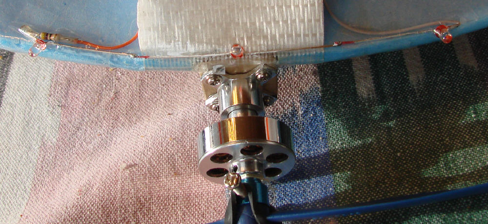 Above: C20 1500Kv motor ready for testing, and it's firewall mount in place with four servo screws. (I used a dremel tool to open up the center hole in the firewall further to be sure to clear the rear end of the motor shaft nicely.)