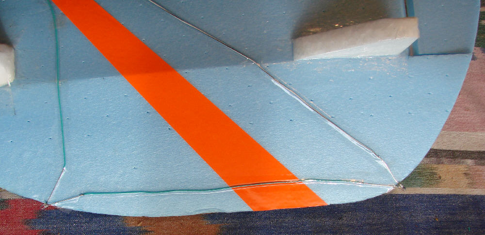 Above: Before the motor mount was epoxied in place, a 2mm CF rod stiffener was installed across the wing 2" ack from the center front; A groove was first cut with an adjustable temperature soldering iron so that the CF rod would sit inset flush with the surface. It was glued in place with foam-safe CyA glue.