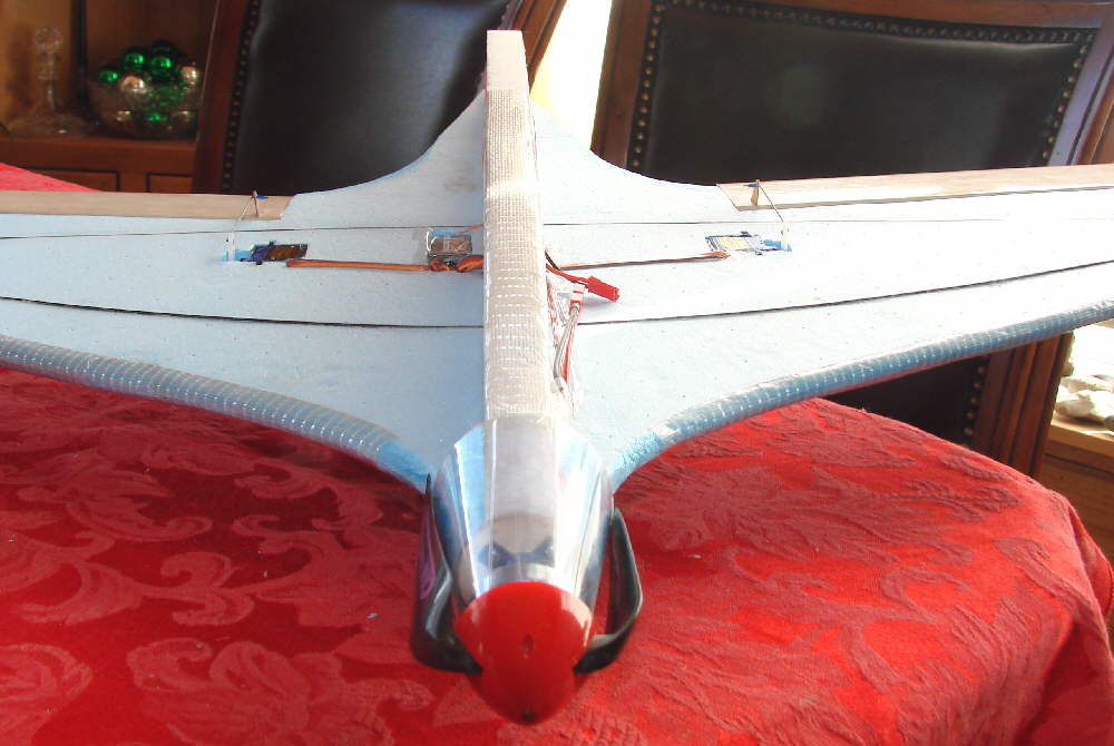 Above: some lead is temporarily taped in place, ready for test glides to establish the starting balance point of this particular wing. The elevons were taped in place with their top surface flush with the upper surface of the lower wing panel; the rudder was also taped in place. I actually taped on about 4 ounces of lead, then adjusted the positioning of some of it until the glide was smooth with no indication of either stalling / porpoising, or diving. I then marked this point as the balance point to use for first flights. Final balance adjustment will be accomplished by shifting the position of the flight battery.