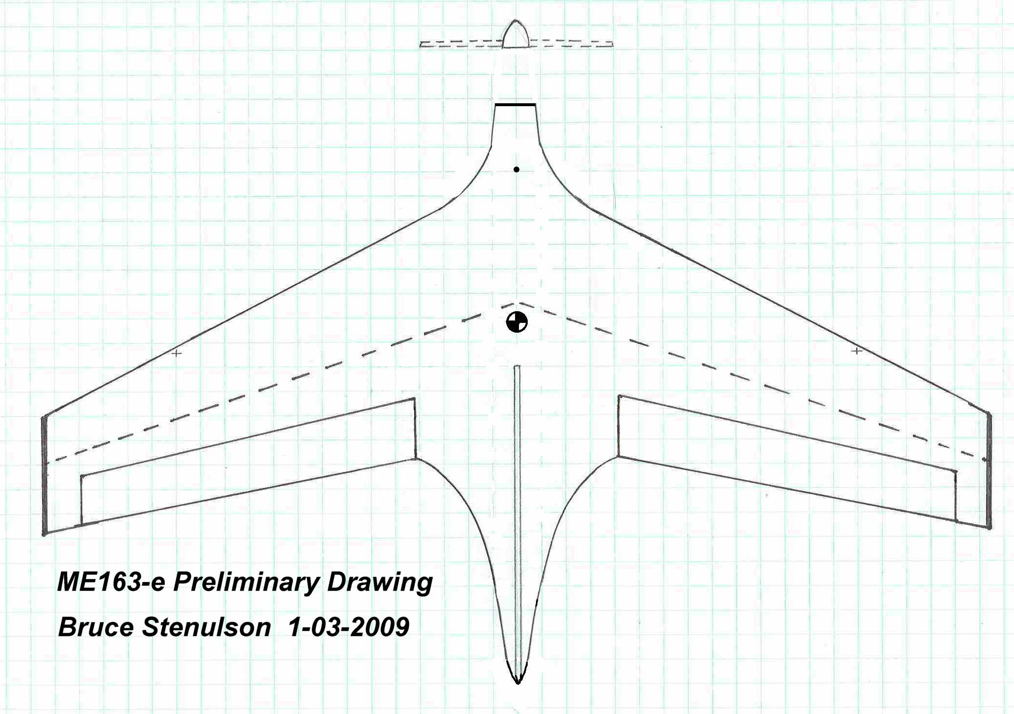 (Below:) This is the edited version of the first rough plan for a variant of the ME163-e, designed for e-power with an 8x4 to 9x4.5 folding prop. 39" span, 26-1/4" O.A. length, top KF step @ 50%.