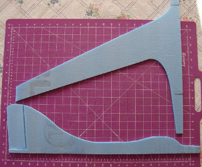 (above:) To start the build, once the rough plan was drawn on the graph paper, I started marking directly on a sheet of Bluecor PP foam. I cut the main wing panel foam, then cut out the two upper layer foam sections and the upper fuselage section.