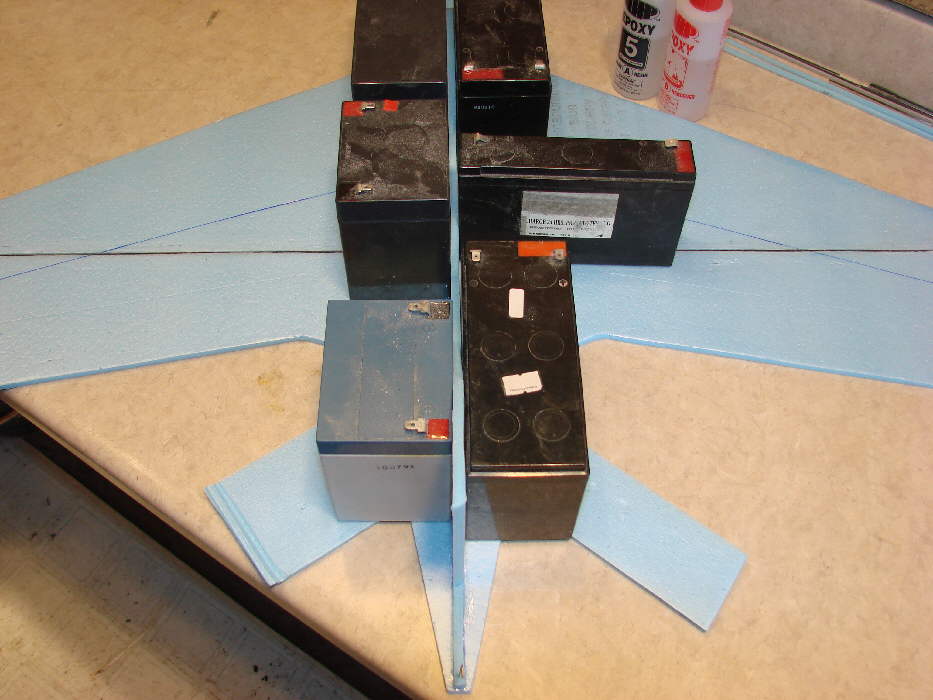 Above: The upper fuselage is being epoxied in place, held in position by my collection of old gel cell batteries.