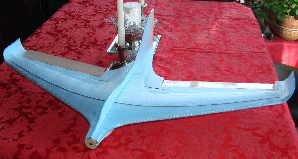 (above:) Me163-e main wing structure complete; wingtips and wing leading edges are shaped and heat tempered. (I carve away excell foam in places as appropriate with a sharp razor knife before using a covering iron to complete the heat forming / shaping / foam tempering.)