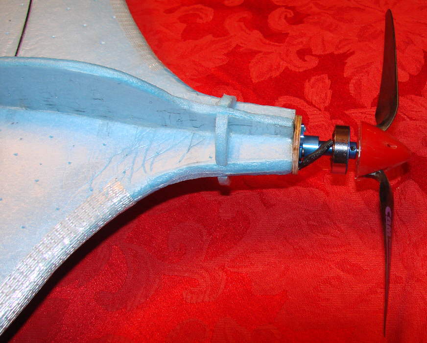 Above & below: the motor is now mounted in the motor mount on the firewall, with the folding prop temporarily slid in place. Some foam filler blocks will be contoured to fill the nose behind the firewall. Then flat polycarbonate plastic sheet (from a two litre soda bottle) will be formed into a conical motor fareing cowl and taped in place.