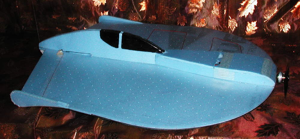 The elevons are sized nicely to provide excellent control. The upper and lower profile fuselages were designed to both add to the visual impression of a "UFO" inspired craft, as well as to contribute to the structural stiffness in the longitudinal direction.