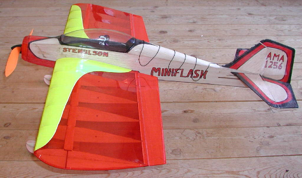 It's winter flying season as these photos are taken, so my MINIFLASH is on skis, on longer-than-stock landing gear legs. I did most of the 'artwort' on the bare wood structure of the fuselage, then covered it with clear Doculam material. The wing is covered with Ultracote light transparent film. The Flourescent Yellow Ultracote was added to the top surface of the wing to add extra aircraft 'attitude definition'- this one is set up with a fast roll rate & radical control throws, taking advantage of the Exponentials on my computer transmitter to keep it handling smoothly at modest control stick deflections.
