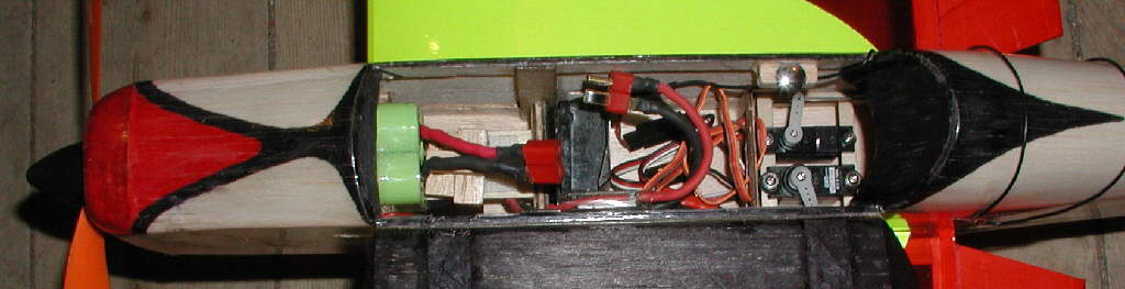 Getting the battery far enough forward to balance properly so that it will fly smoothly was a bit of a challenge; I initially set it up to balance 3/4" behind the spar, as recomnmended in the kit instruction booklet. This was as far forward as I could shift the batteries in the available space, without resorting to butchering some of the interior structure. This unfortunately led to some really strange handling characteristics... the balance needed to be moved forward substantially more. (Without the longer landing gear legs, it would have been even worse!)