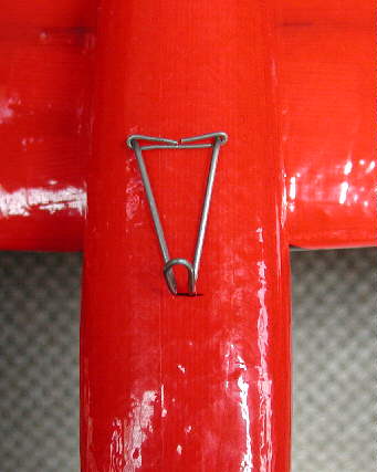This BD5 is now also set up with a bungi launch tow hook (see further info below.) The hook is lacated at the leading edge of the wing, taped to the wing with strapping tape, and then covered with more of the colored packaging tape. The BD5 handles very nicely on the bungi launch- smooth and predictable!