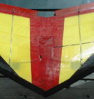 You'll also notice a 'white line' in the photo above at the leading edges of the horizontal and vertical stabilizers; I used some 1/8" diameter plastic tube to clean up the drag characteristics of the coroplast material; I taped it in place with 3/4" wide scotch "Crystal Clear Tape". I also taped a section at the trailing edge of the elevator.