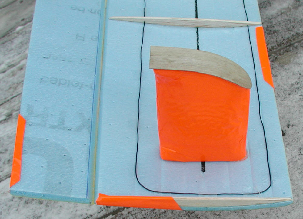 The upper 'superstructure' is BlueCor. Three layers are laminated together for the main section, going into single thickness above. It is then epoxied onto the top (uncovered section) of the EPP Hull. This gives plenty of strength without having to use a 'crutch' or lengthwise spar, and allows burying the radio gear & servos into the fuselage for minimal wind drag.