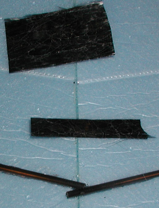 [Above] 1/8" C.F. tube spars on underside of wing, ends slightly overlapped, ready for overlay of sevral layers of carbon fiber tow