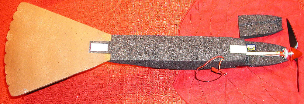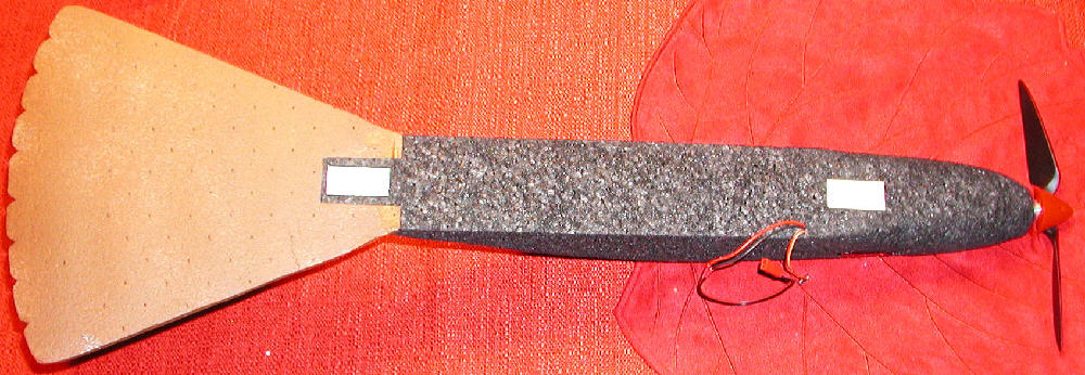 The solid EPP foam body is made from a block of 1.3# density foam that is 2-3/8" wide, 2-3/4" high, and 18-5/8" long, shaped by band-sawing & then carving with a sharp fillet knife before sanding, to end up looking somewhat like a bird's body. After shaping, & with the motor mount shaft and wing mount plates epoxied in place, the body weight only 1.0 ounce. (The tail group, assembled, glued, & painted, weighs 1/2 ounce.)