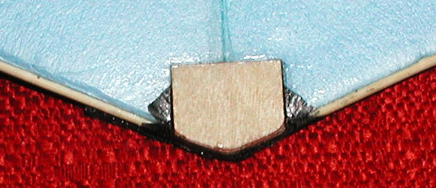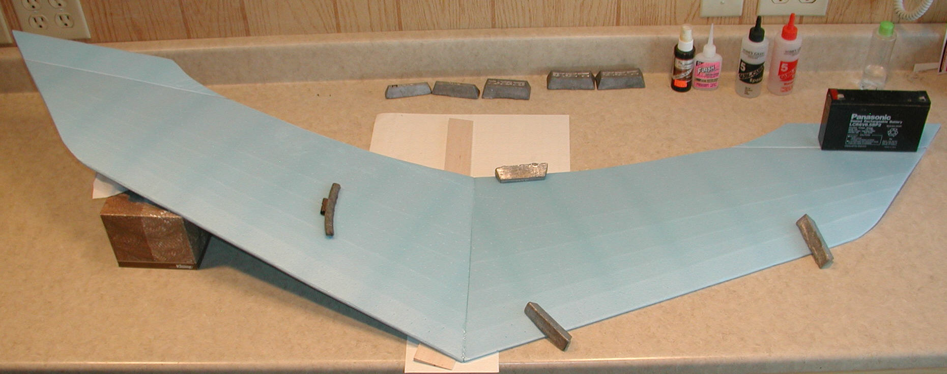 [Above] Center was sanded for dihedral joint, 'woodpeckered' so 5 minute epoxy would penetrate deeper, then glued. Lead weights& a handy block were used to hold everything in position while the epoxy set.