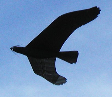 I will report that SOARBIRD II is climbing well, looping tightly- (4 to 5 foot loops), & able to roll OK in it's present configuration; it was never meant to fly upside down, but it can easily do enough of the crazy maneuvers to possibly scare off agressive hawks. So far, the hawks that have cruised by have been only curious, and have shown no agressive tendancies... that should be expected to change in the spring, however, when flying near nesting areas. The ravens always come over to check out the new bird in the neighborhood, but while they talk the trash talk, they also have not been agressive- they do sometimes stay around SOARBIRD longer than the hawks.