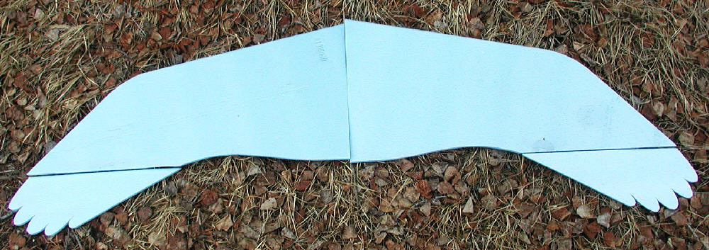 SOARBIRD has a new wing designed & cut out, ready for assembly. I've reduced the span to fit each half across the narrower dimension of a sheet of Fan Fold Foam, (I'm using double faced BlueCor), so two sets of wings can be cut from a single sheet of this material. In dodging the folds, the wingspan ends up at about 47".