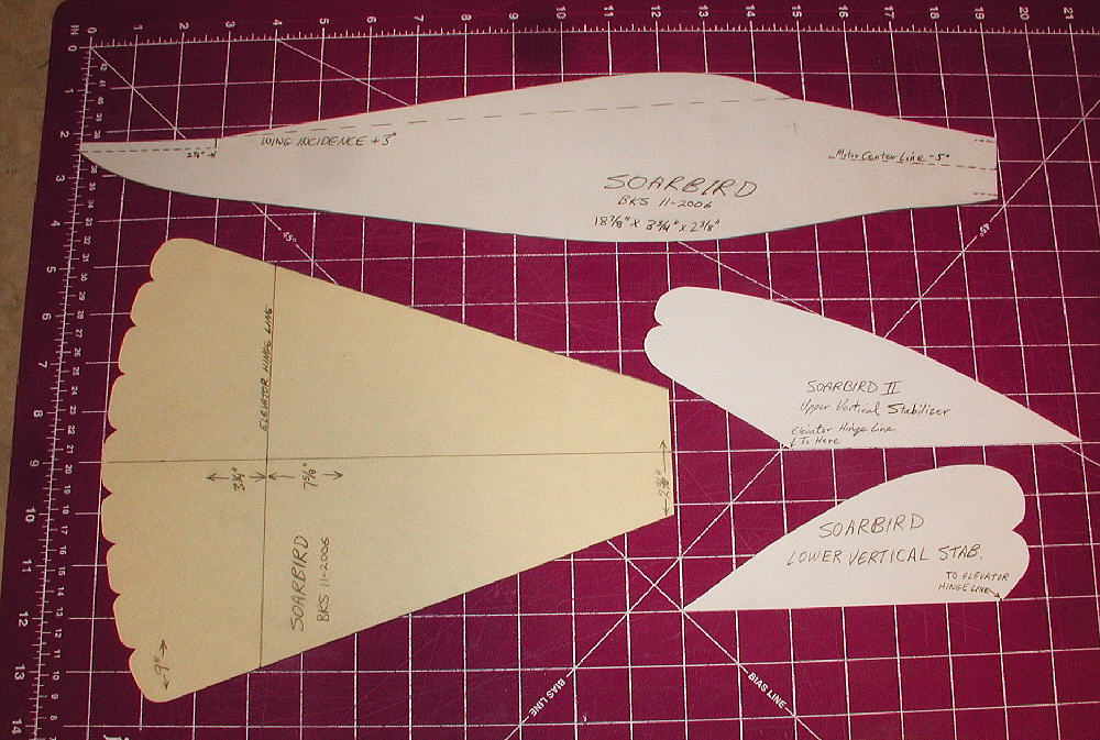 Here's two new photos; the lower one is of the wing tip modification I did to the 53" span wing on SOARBIRD II. The cutting template for the new 47" wing is also shown (above) on a 1" grid cutting mat background for scale.