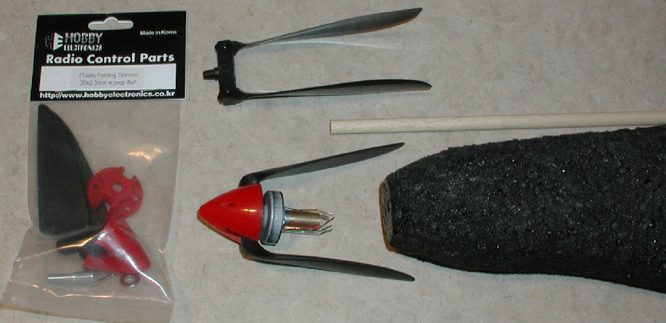 The folding prop with the red spinner was bought from BPHobbies; it's set up with 8x6 blades. (The hitch in using this inexpensive folding prop set is that the motor shaft adaptors available are either 2.3mm or 3.2mm, while the shafts for GBv motors are 3.0mm.... I'll have a friend with a mini lathe drill out the collet to 3mm for me... I've butchered too many of them trying to do it without a lathe! The good news is the reasonable price- under $10.00