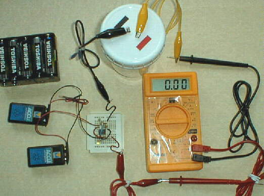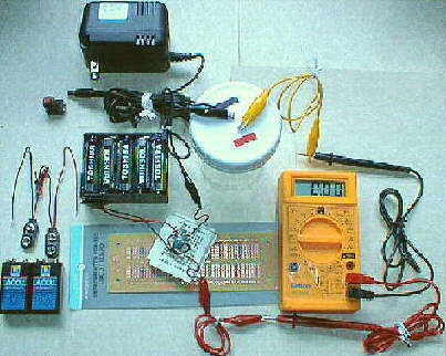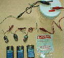 Note that alligator clip test leads are used to connect between the parts, and a bare alligator clip is shown connecting one battery lead to one bulb lead. Radio shack should be able to provide most of the parts we'll show on this page, while Mouser Electronics supplied the bulb shown in the photo; you can read their info in the larger version of the photo.
