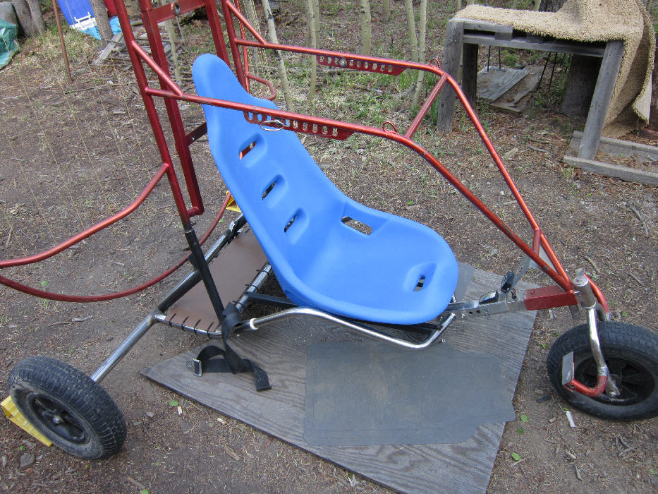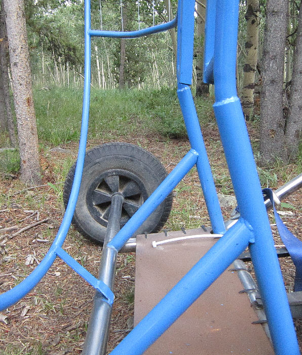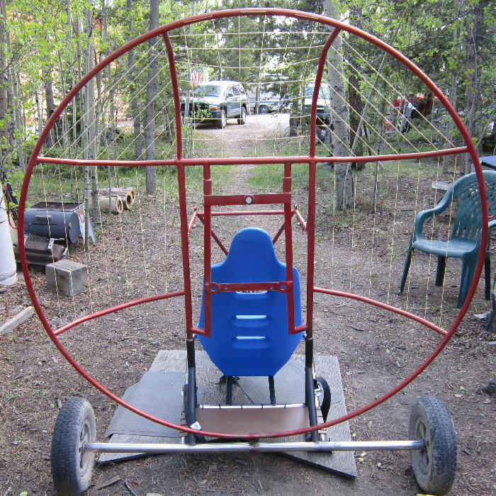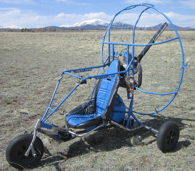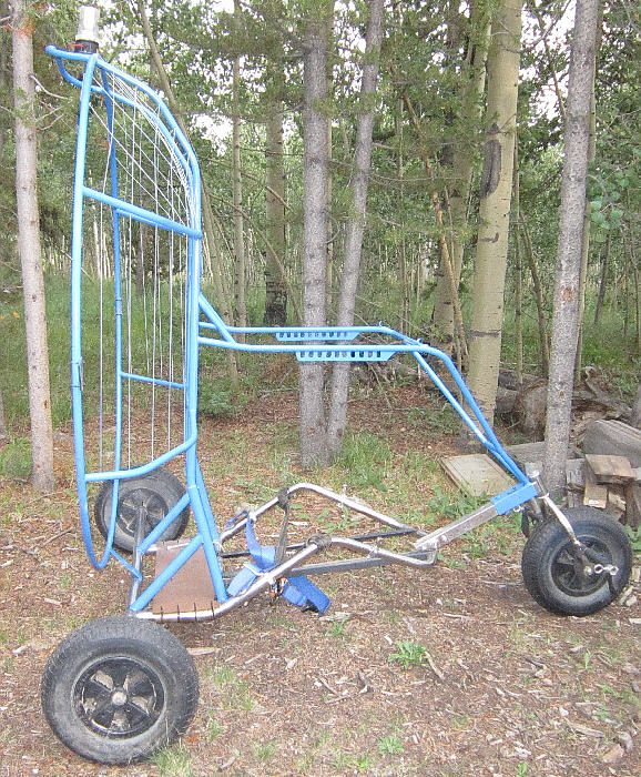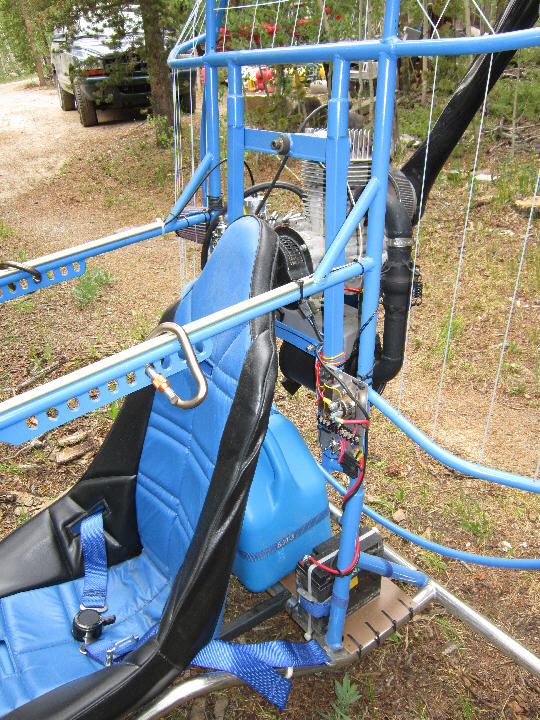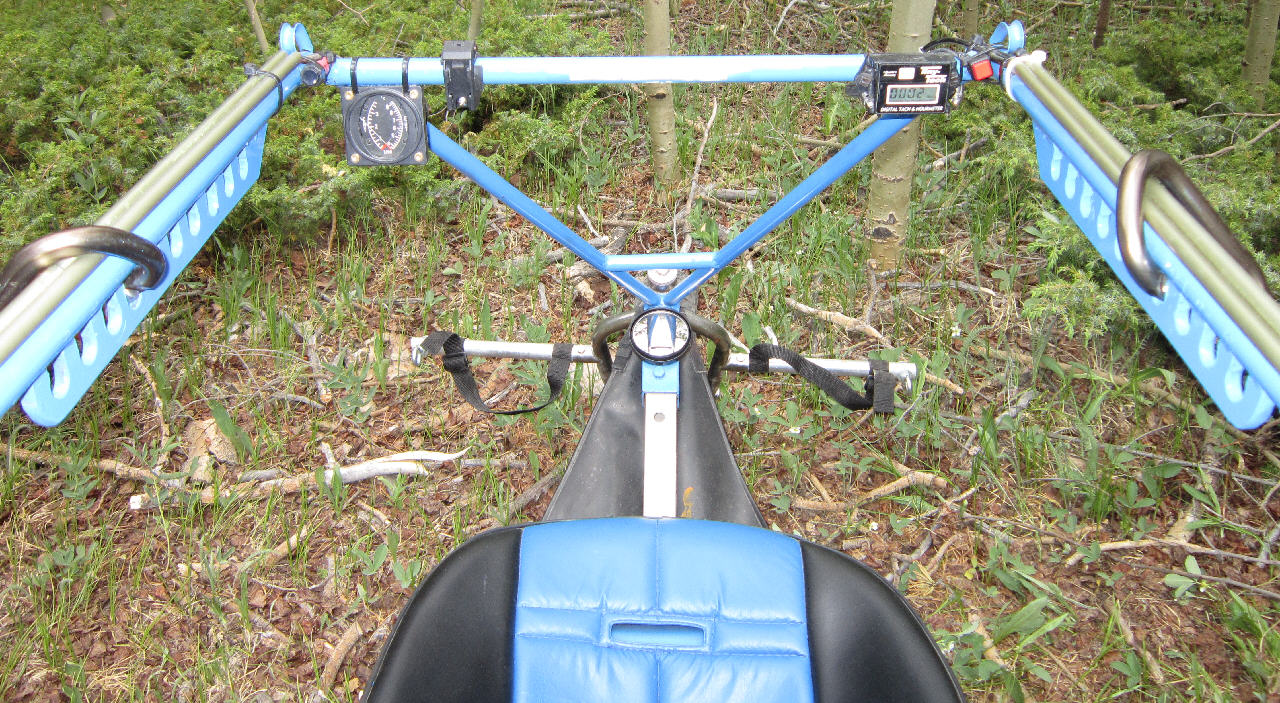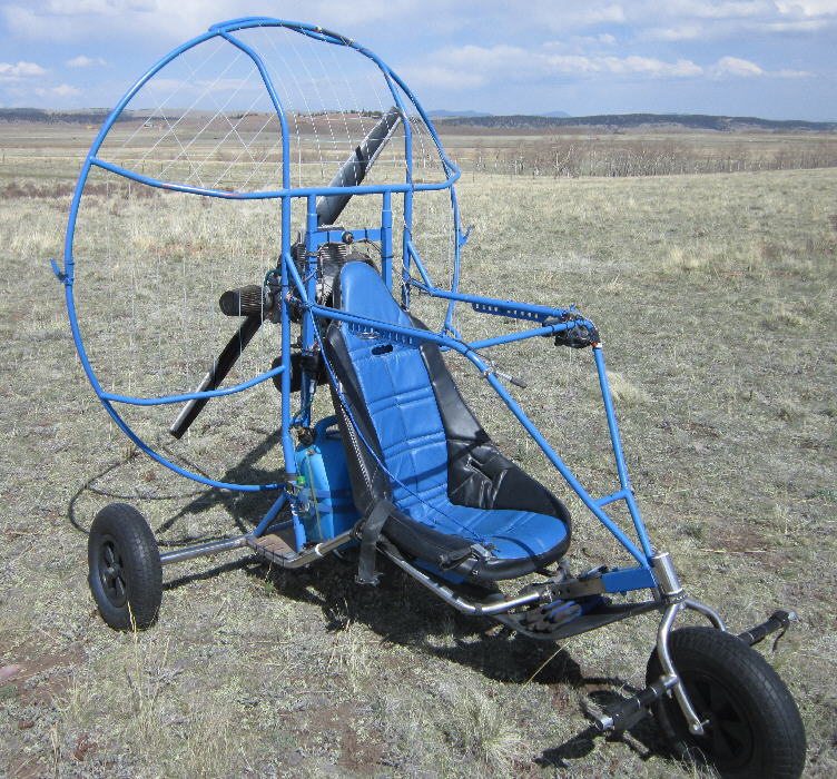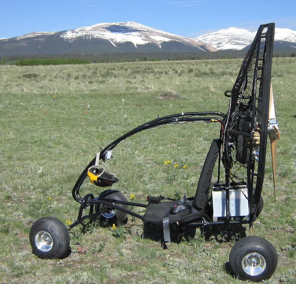 The Trike's under-carriage is a Flexifoil Trike Buggy with the stainless steel main frame. The steel tube propeller cage is 60" inside diameter allowing the use of more efficient larger diameter propellers. The motor mount frame was built out to mount the HIRTH F33. The rear axle has a fairly wide stance at 60", and the wheels are 15" diameter x ~4" wide for good ground clearance and good stability. It had a 10 gallon capacity tank seat when I bought it, which is not legal for FAR103 ultralight operations; that had to go. It also had a radically undersized prop mounted, unsuitable for running on this 313cc HIRTH F33B engine.