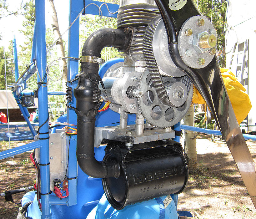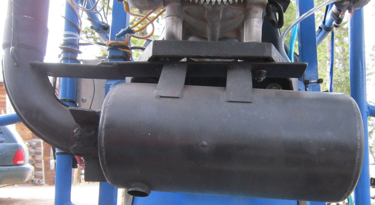 TECH NOTE: This newer style of Hirth F33 exhaust developed a lot of cracks and breaks during the first 5 hours of flight. I had welding done on it and reinforcing metal added in stages to it in two major areas to make it strong enough to hold up in flight. The two thin mounting brakets broke away, and the weld from the inlet tube into the main muffler body failed. The full length cross-plate bracket was added, as were the tube to muffler body braces in three places; the original thin mounting brackets had to be totally replaced with wider stronger material. While this beefing up work might have been accomplished more 'elegantly', the idea was to get it back together to fly! This works.
