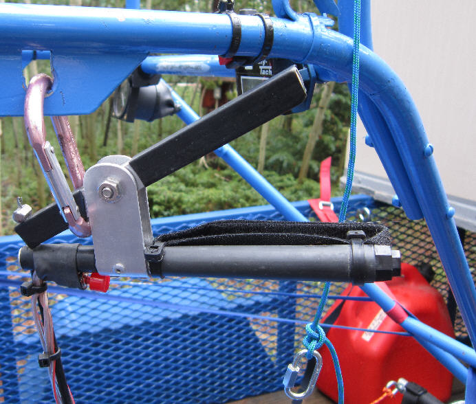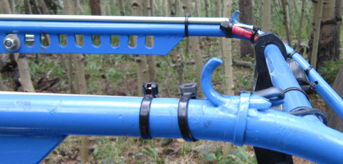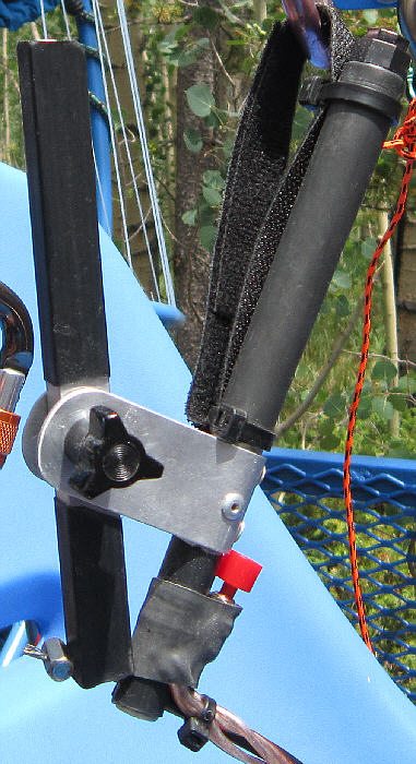 An engine start switch is lashed in place for thumb activation with Kevlar thread before the wiring & final layer of heat shrink were installed. (A new guarded switch has been used to replace the one shown in this photo. I later moved it from the hand throttle and mounted it on the upper hang rail, as it was akward to use on the hand throttle. ) The kill switch is mounted in the end of the handle where it's easily thumb-activated. There is also a second redundant kill switch mounted on the upper right frame, usable in the event that the handle-mounted kill switch should fail.