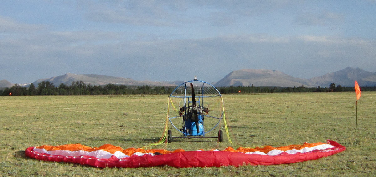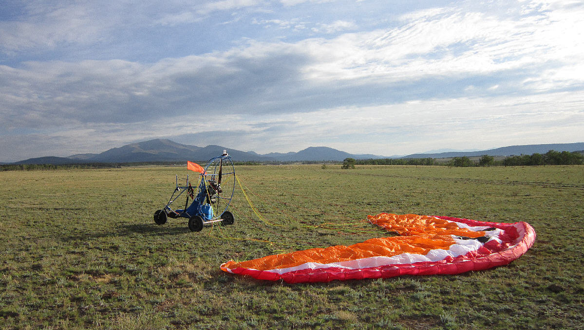 There are aproximately 15 acres of 'lightly groomed' short grass prairie where protruding rocks and some taller ground cover vegetation has been removed. The surface of the central 7 acres is more extensively groomed, offering over 300 yards of good surface in the primary N-S direction from which to take off and land, as well as friendly ground for a variety of ground handling. With an elevation of just a bit under 10,000 feet ASL, the reduced air density and ~30% lower atmospheric air pressure offers it's own challenges for both motors and wings.
