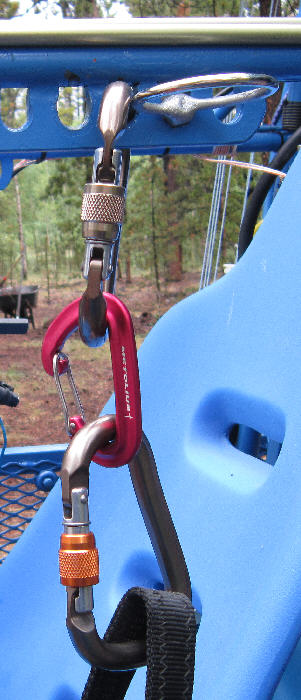 Using 6000 pound rated 1" webbing material from REI, I made up my low hang point loops. The MUSE 3 specifies a distance from the seat to the hook-in carabiners of about 15", so I made up some double layer loops that have a ~3" section where there are three layers of webbing. These were then sewn with #69 bonded polyester thread. Two complete passes with a zig-zag stitch patern run the full lengths of each of the matching loops, and run along the outer edges of the webbing. In the three layer overlap area, additional stitching (non-zigzag) run back and forth from edge to edge throughout the entire overlap area.