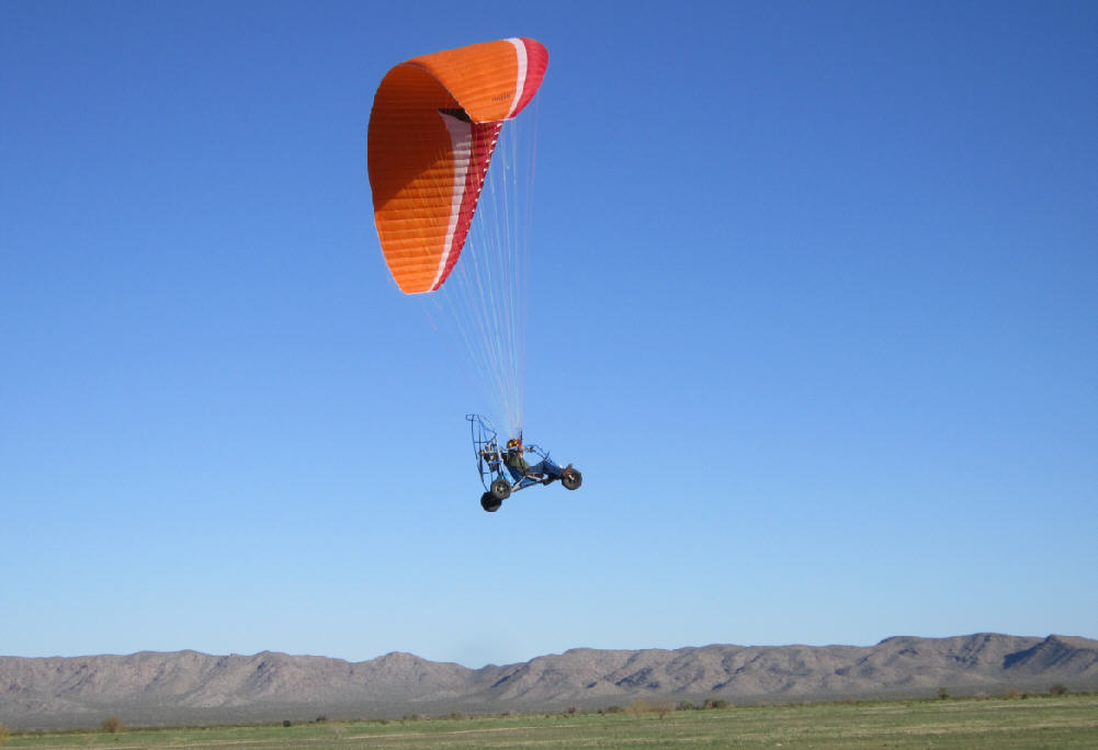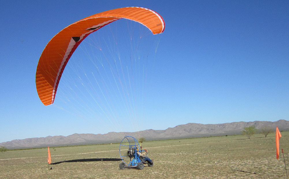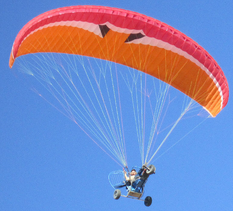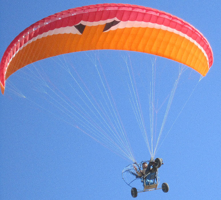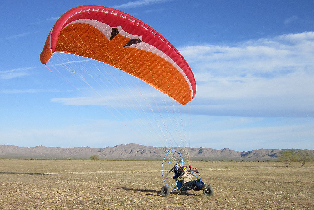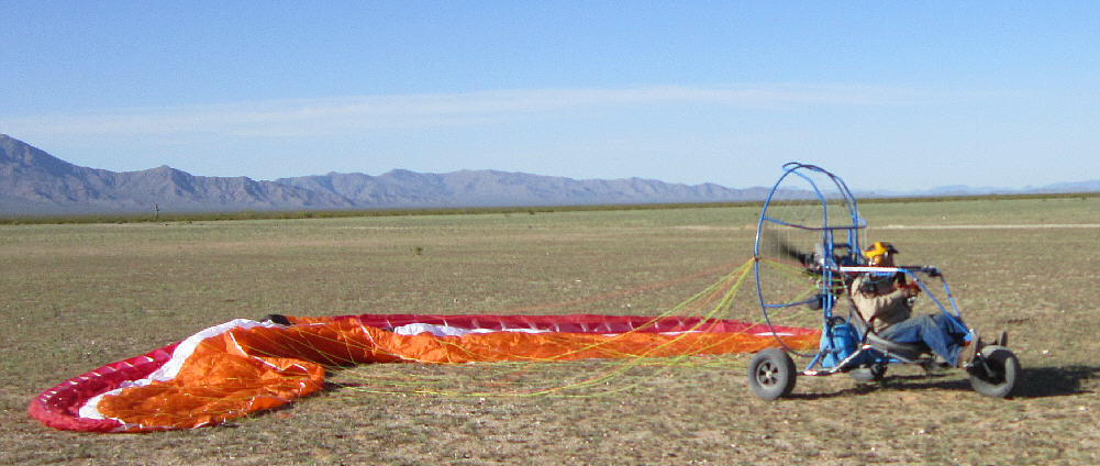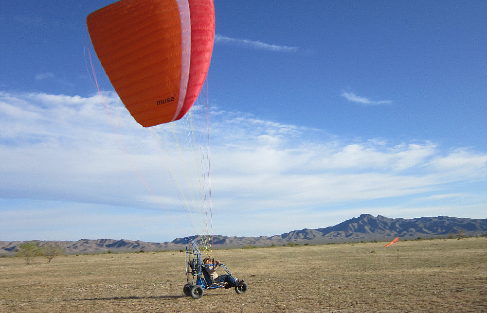 After doing some research, I purchased the 31 square meter XL version of the MacPara Muse 3 Powered paraglider wing/ canopy to fly with this PPG Trike. It has an LTF-EN-A rateing (for both non-powered and powered flight) and very high stability characteristics, easy inflation and launch characteristics, yet is also rated with a glide ratio of 8.3 to 1 (when flown in free-flight mode.) It has a minimum speed of about 15 MPH, and a maximum forward speed of up to 27 MPH when the speed system is engaged. It's built with very adequate sized lines and has a higher load capacity rating (close to 400 pouinds) when flown with a motor system. It is built with a second set of riser suspension points, just above those used for free flight service, provided for use in powered paragliding.