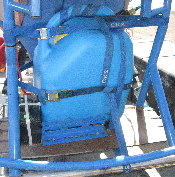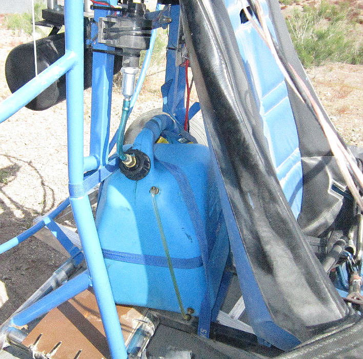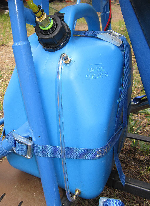 [Above:] The 5 gallon Scepter fuel tank is fitted with a clear 'fuel level view tube' to allow for easily checking the fuel level. Holes were drilled and tapped for the 1/8" NPT fittings and the threads were sealed during installation with 'Plumber's Goop' which is a flexible sealant with good adhesion qualities for this application. I used clear vinyl tubing for the vsight tube. It's easy to see the fuel level in this tube at a glance. Pep Boys carries these Scepter brand gas cans; they are made from a tough material. The part which seals off the dispensing spout when it is enclosed within the fuel tank can be modified by cutting away excess plastic, then drilling the center for male / female brass fittings. The black flange gasket can be removed from the filler nozzle and installed around that modified 'cap' so that it seals there.