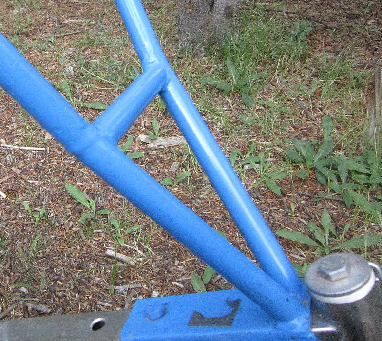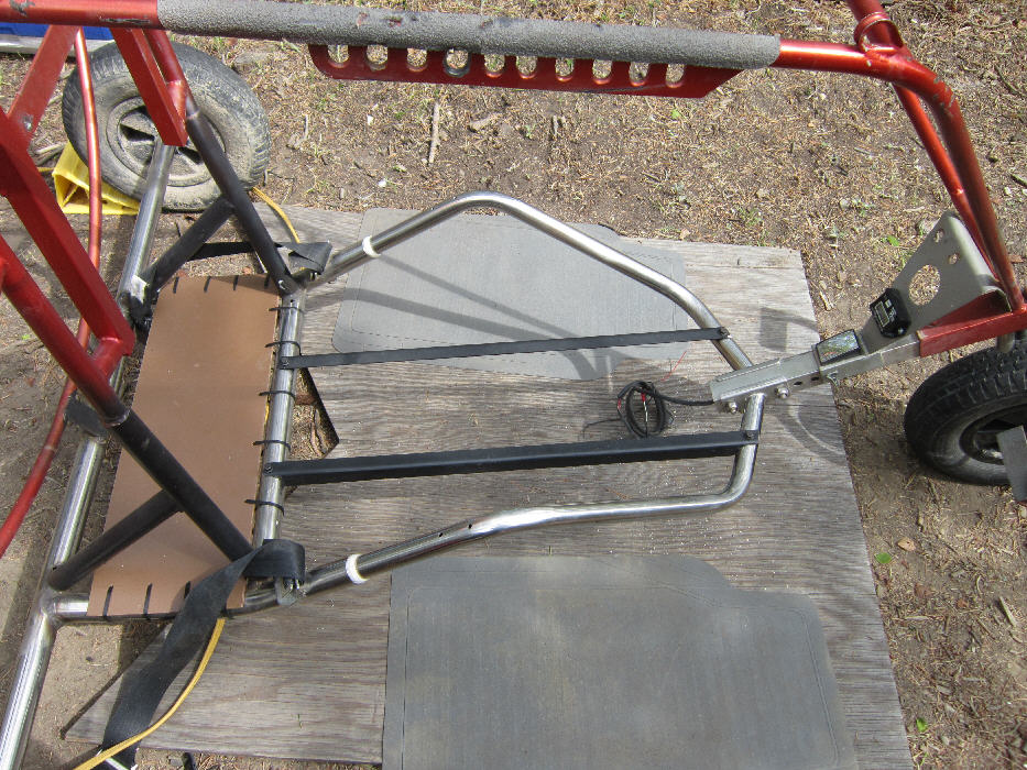 A panel was cut & mounted to the rear lower frame (secured in place with a lot of heavy duty cable ties) to support the new fuel tank and Gel Cell battery for the starting & electrical system. This panel's final position is farther forward from what is shown in this early photo, with it's forward edge supported by the frame cross-tube.
