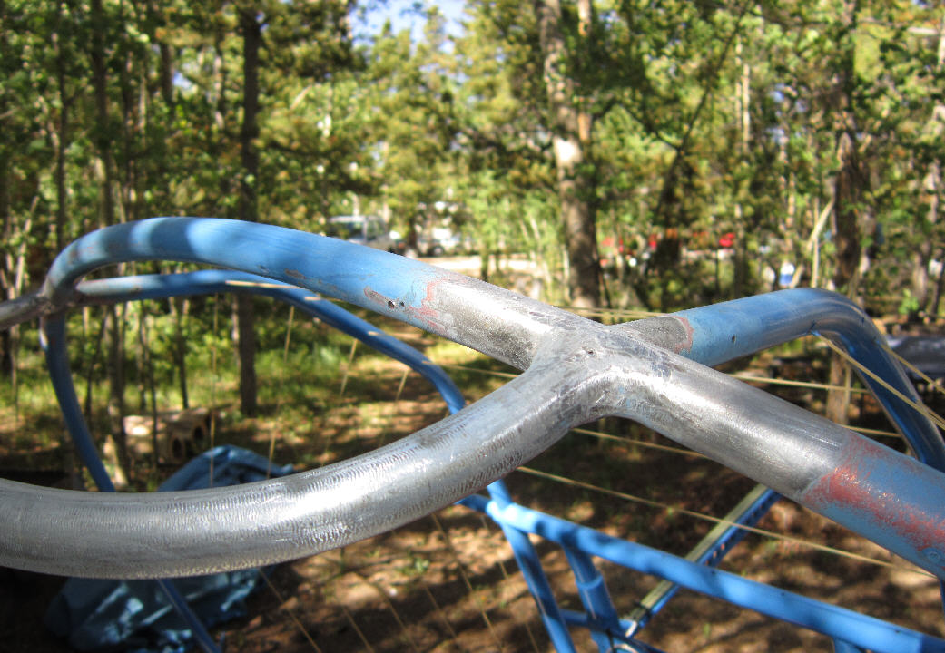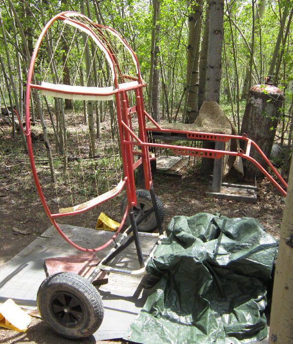 To remedy this, the entire engine installation and seat were removed from the frame. Then the support at the bottom center of the prop cage was cut, and the forward extensions of the hang rail frame were cut at a point ~2" above the front lower cross brace tube.