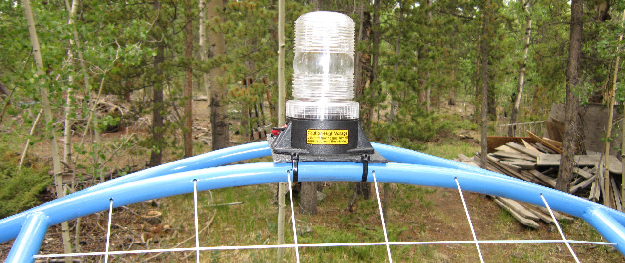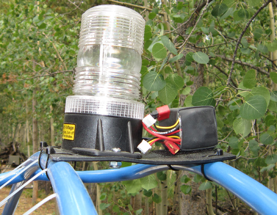 This strobe, with well over three mile visibility, is an efficient circuitry design that only requires 300 mA operating current. (I bought it from www.BlueskyPPG.com ) Rather than running wires along the propeller cage frame, this unit is being powered by a 4 cell 1250 mAH lithium ion battery pack which mounts with industrial strength velcro just aft of the strobe. That gives about four hours of strobe operation on one battery charge. I have three of the strobe power battery packs which I built up for this application at this time. By limiting the strobe's wiring to a very few inches, possible radio interference should also be minimized.