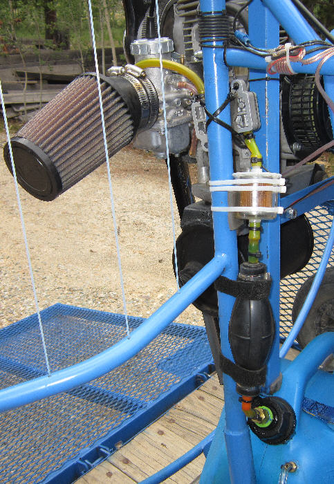 [Above:] I use a low pressure electric fuel pump which I've installed on the Bluehawk. It is controlled by a separate switch on the electrical control panel. This provides consistent fuel level in the carboretor throughout the entire operating RPM range. (My impression was that the vacuum pulse driven fuel pump does not provide adequate fuel flow volume on the F33 engine at 6100 to 6200 RPM; this results in a leaner run at peak RPM. With the electric fuel pump, this is not an issue.
