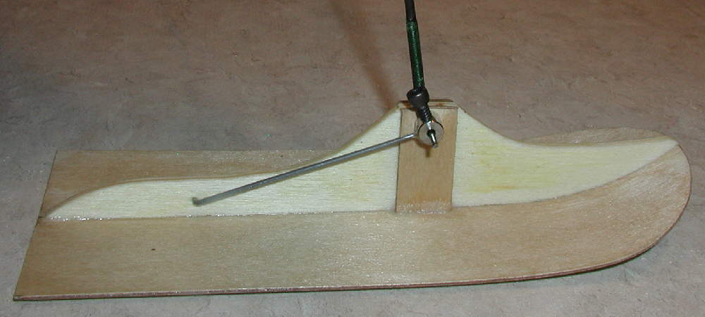 [Above:] Here's a closer look at the ski. It's made from a 1/32" birch plywood, with a lite ply center spine which has 1/16" birch ply doublers where the axle goes through the top. The torque rod is built with music wire soldered into a matching sized hole in the 1/16" brass wheel colar.