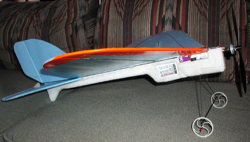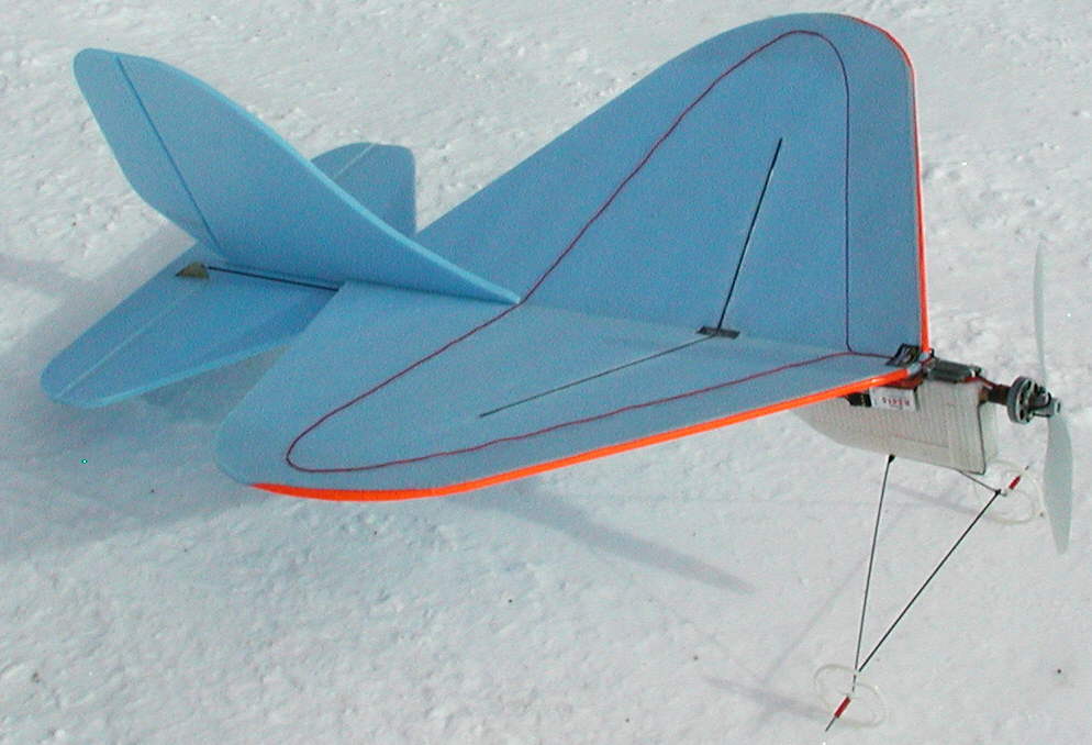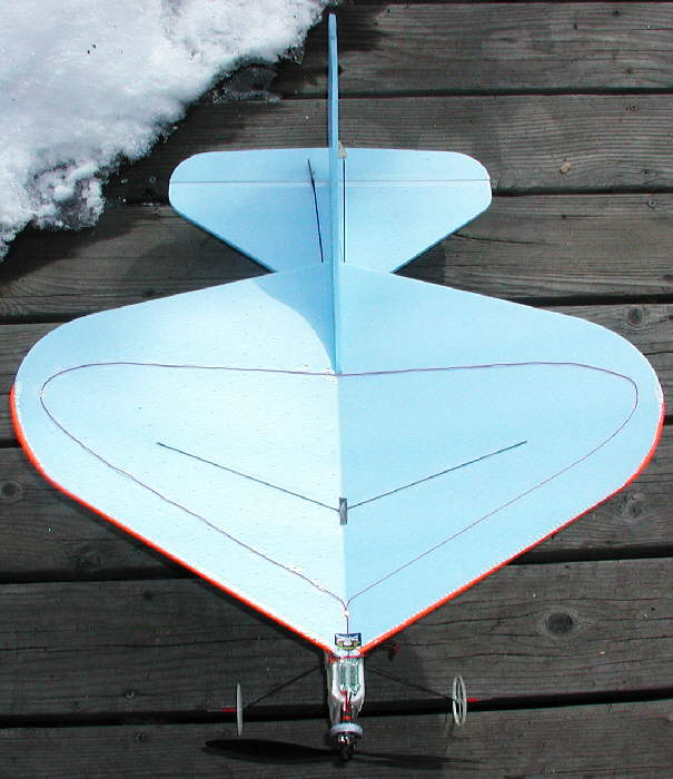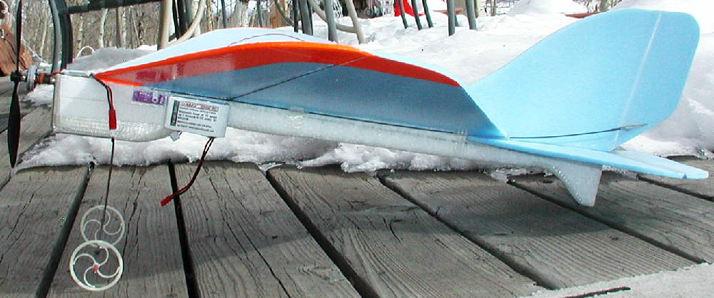 CURVACIOUS has an EPP underbody, and a bluecor wing that's 23-1/2" span, and 18" maximum chord. Power is provided by a 23 wrap [Y] GBv motor turning a 9x7 GWS slowflyer prop on a 2S 800 mAH CSRC LiPoly pack; (Other lighter packs were not performing as well in the cold Colorado New Year's Day flying conditions.)