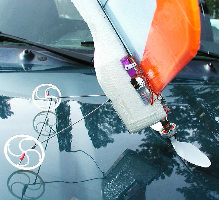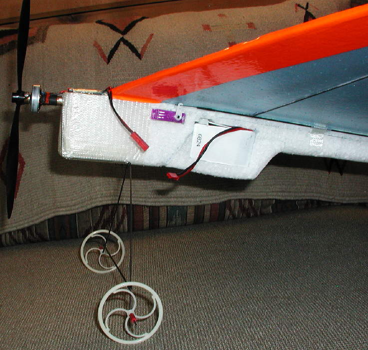 The radio antenna is run in a patern on the top of the wing; it's a red wire on the CORONA RS410 receiver. When I ran out of wire, I completed the full oval patern with a fine tip red sharpie pen!