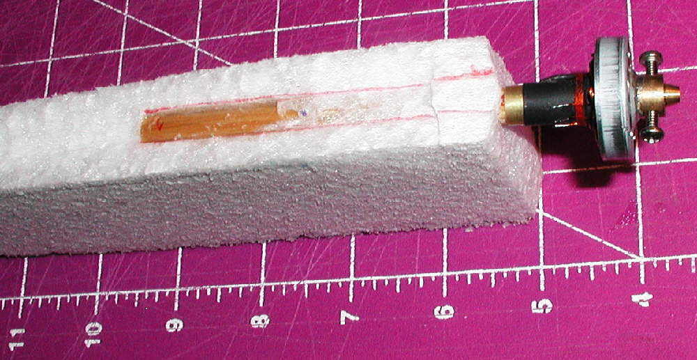 For a motor mount to match the 5/16" I.D. brass tube on my GBv kit motor, I used a 4" section of cedar arrow shaft. I marked it for installation into the EPP foam with both down thrust and right thrust, cut the slot in the foam, and glued it oin place with low temperature hot melt glue.