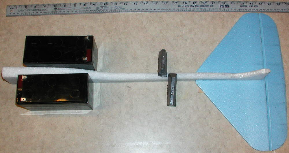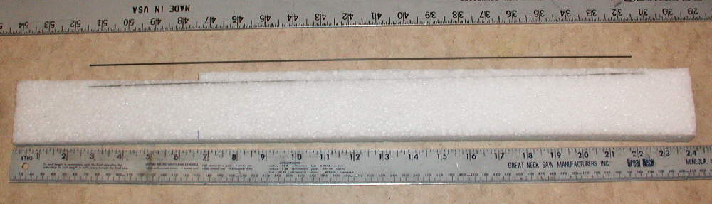 I started making the fuselage by cutting a piece of 1.3 # density EPP foam to size; it's 24" long and 2-3/8" high. It's 3/8" wide at the tail end, tapered to 1" wide at the front end. Next, I cut in the horizontal stabilizer mount deck at a minus 2 degree angle, as shown in the photo above. (That places the flat plate wing at 2 degrees positive incidence relative to the horizontal stabilizer.)
