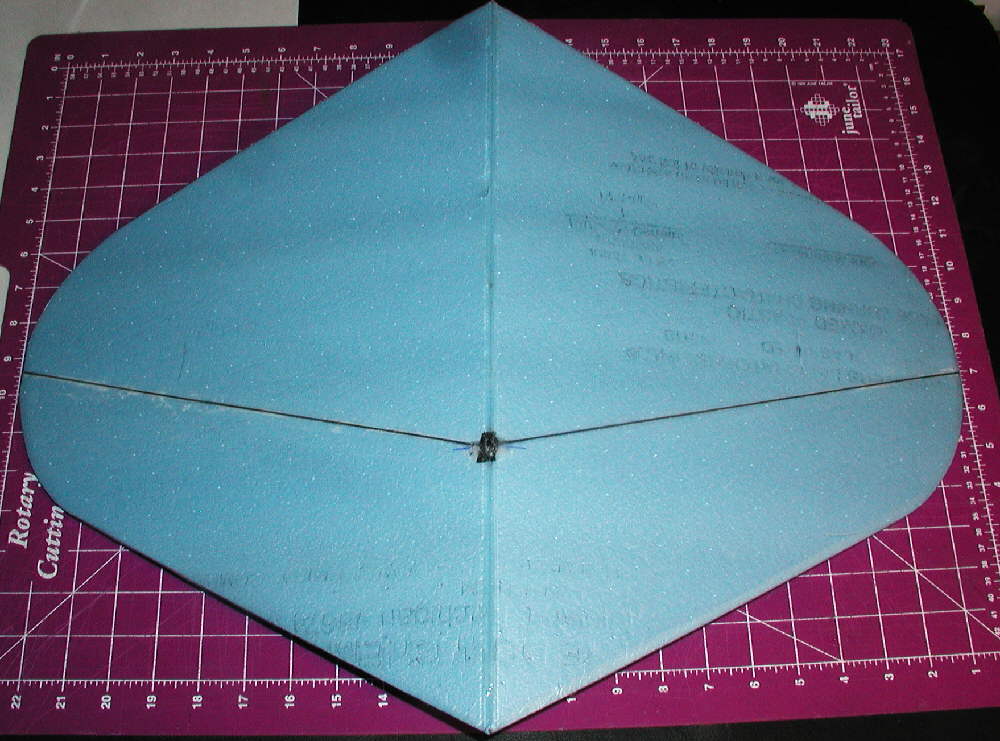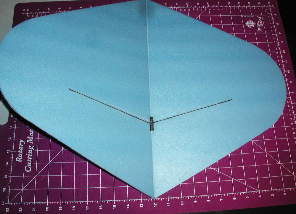 Once the wing is cut out, a slit is made about half way through the foam on the underside. I then made a smooth crease on the top side above this slit before it was folded over a sharp edge. Next, with the bottom side up & the slit / gap exposed, I blocked the center with a 2-3/4" high piece of Bluecor to set the dihedral angle, and ran a bead of hot melt glue in the slit / split to set the dihedral at that amount.