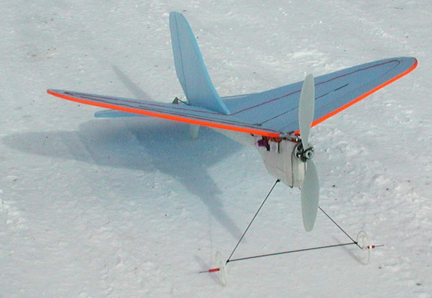 The motor is a GoBrushless GBv kit motor with 23 wraps of 26 gauge wire, Y termination, driven by a Castle Creations Thunderbird 9 ESC. For outdoor flying, I'm using a 9x7 GWS slowflyer prop, which provides almost unlimited vertical, and the ability to do high-alpha maneuvers. Handling is responsive, but very predictable; it'll take off, turn, and land in the same place on the snowpacked road behind me in the photo above!