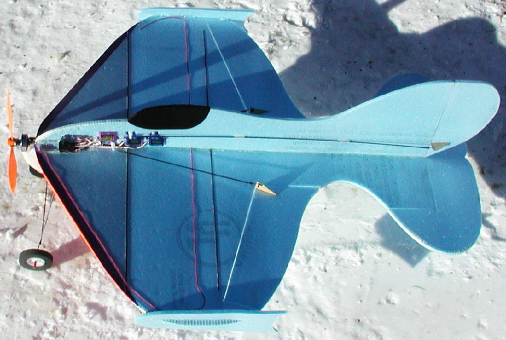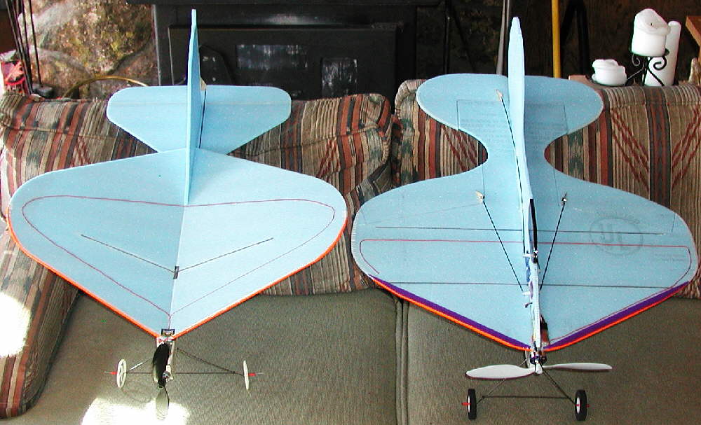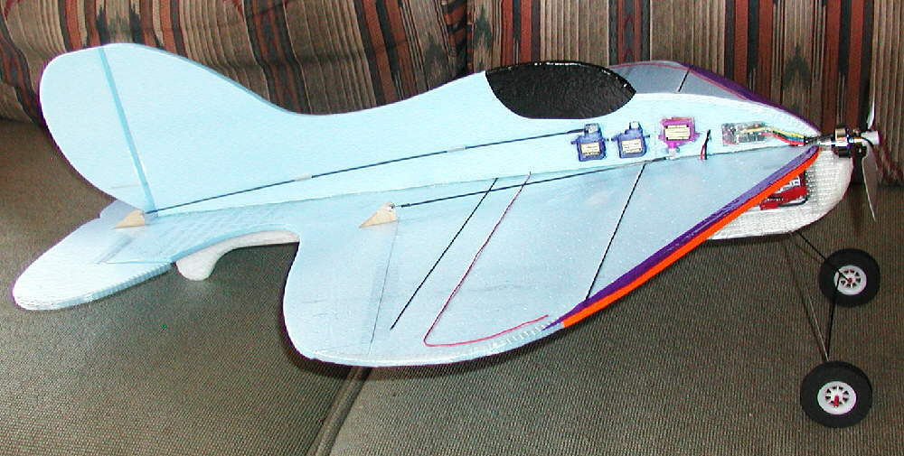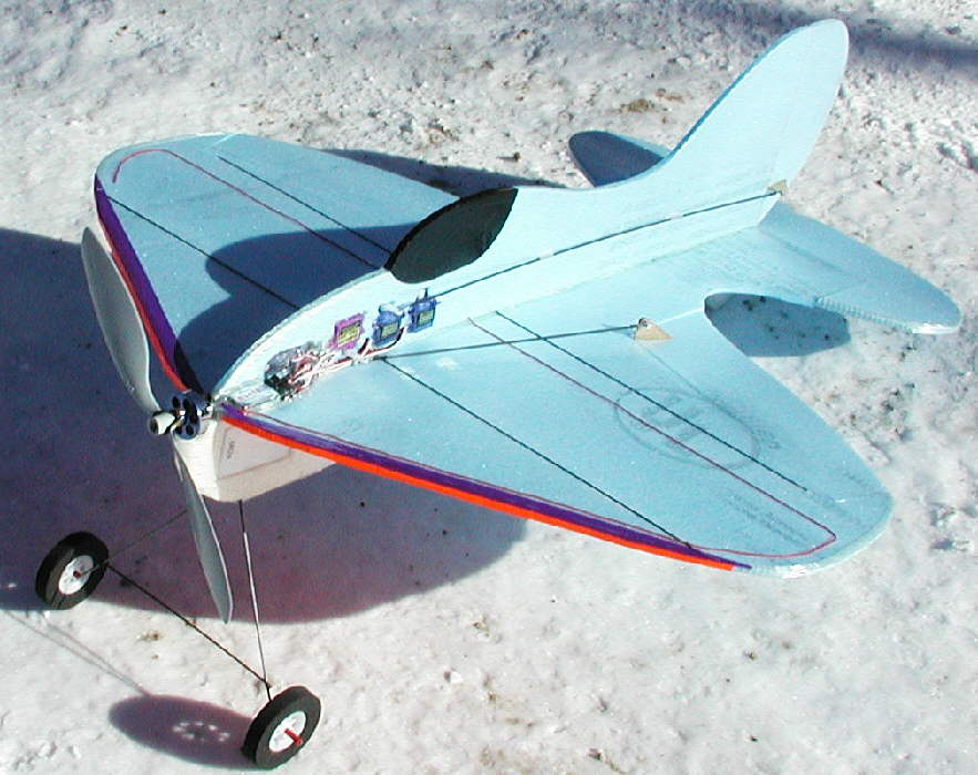 [Update on January 14th, 2006]: CURVACIOUS! II is in the air! CURVY2 is set up with large ailerons, a large counterbalanced elevator, and has added wing tip plates for enhanced low speed handling. Wingspan is 23-1/2"; overall length, not counting the motor, is 26-3/4". This curvy lady was designed for nimble aerobatic outdoor flying, so she's not built out as a lightweight indoor flyer might be built.... strength and resiliency, coupled with a fairly powerful drive system for her weight, are all part of this design.