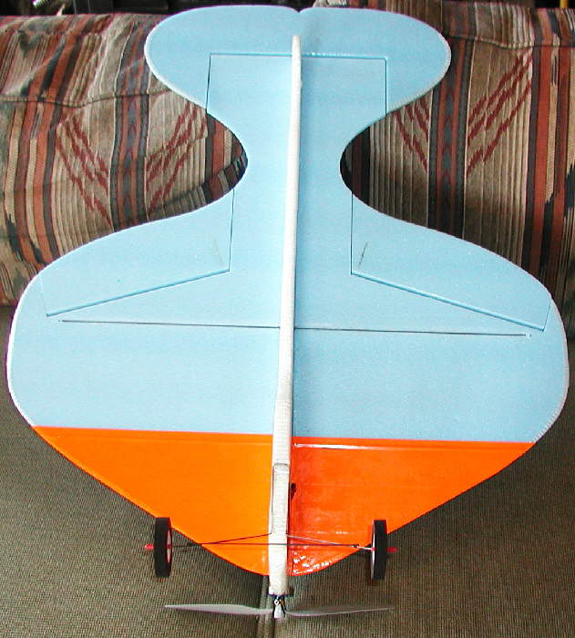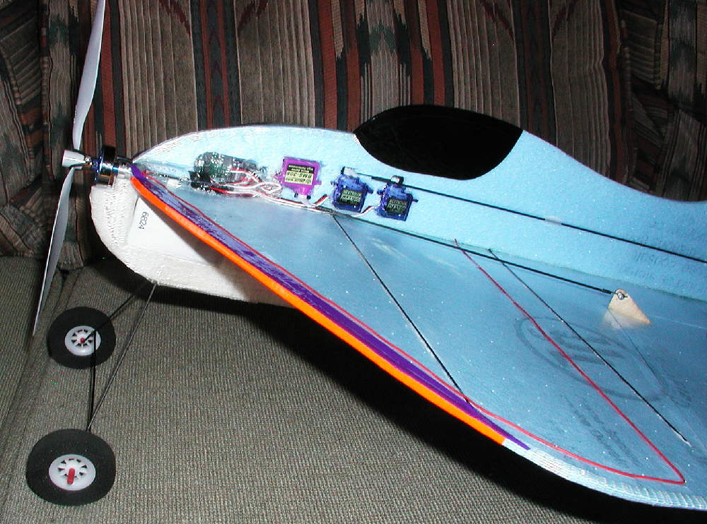 The motor is one of the HexTronik '24 gram' motors, turning a GWS 8x6 slowflyer porp on a 3S 640 mAH battery pack. Flying weight with this 2 ounce battery pack in place is at 9 ounces.
